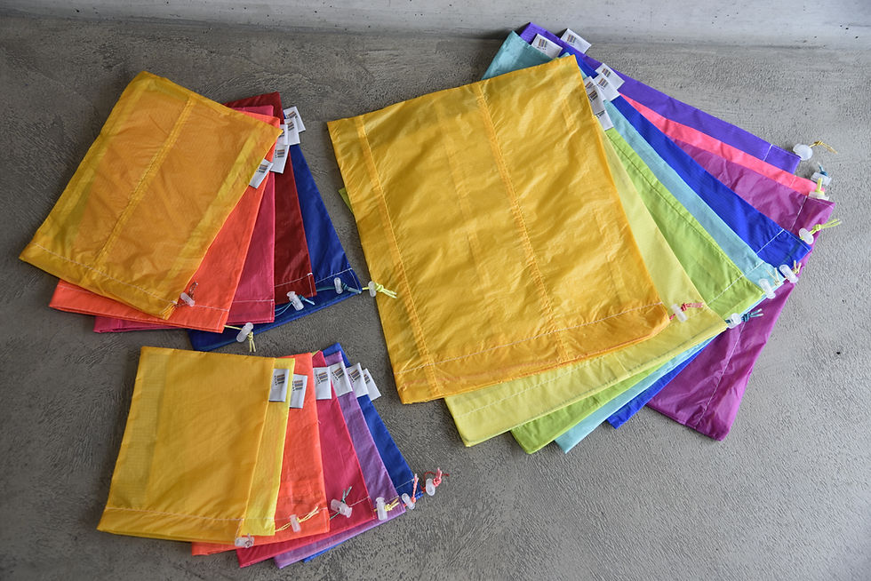 Wir verarbeiten ausschliesslich Gleitschirmstoff von ausgedienten Gleitschirmen. So entstehen kreative Upcycling-Produkte.